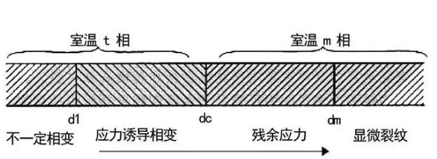 誘發(fā)顯維裂紋的臨界直徑dm。當(dāng)d>dc的晶粒室溫下為m相,由于相變的體積效應(yīng),產(chǎn)生顯微裂紋或應(yīng)力。d>dm的晶粒相變時(shí),相變產(chǎn)生的積累變形大,誘發(fā)顯微裂紋。dc>d>dm的晶粒相變時(shí),相變產(chǎn)生的積累變形小,不足誘發(fā)顯維裂紋,當(dāng)其周圍存在殘余應(yīng)力。