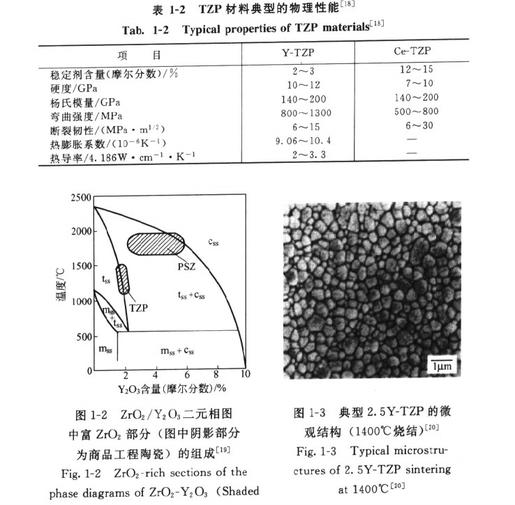其中TZP是ZTC材料中室溫力學(xué)性能最高的一種材料(其力學(xué)性能見表1-2181),TZP中又以Y2O2作為穩(wěn)定劑的Y-TZP應(yīng)用最為廣泛。TZP材料的制備以相圖(圖1-2)作指導(dǎo)19,穩(wěn)定劑Y2O3的含量在1.75%~3.5%(摩爾分?jǐn)?shù))范圍變化。t-ZrO2的含量取決于組成、燒燒結(jié)溫度和時間般在60%~100%之間變化。典型的TZP材料徵觀結(jié)構(gòu)為粒徑為0.5~2m的等軸晶組成的均勻組織21(如圖1-3所示)。當(dāng)原料中含有異類組分(如SiO2)時,在界面上往往存在由異類組分和Y2O3組成的玻璃相。