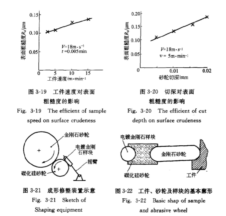 精密時(shí)參數(shù):工件速度3~5mmin-1,砂輪切深O0.005~0.010mm,砂輪速度為18ms1。這樣,試件的表面粗糙度R值可控制在0.16pm以內(nèi)。成形磨削用樹脂結(jié)合劑金剛石砂輪。