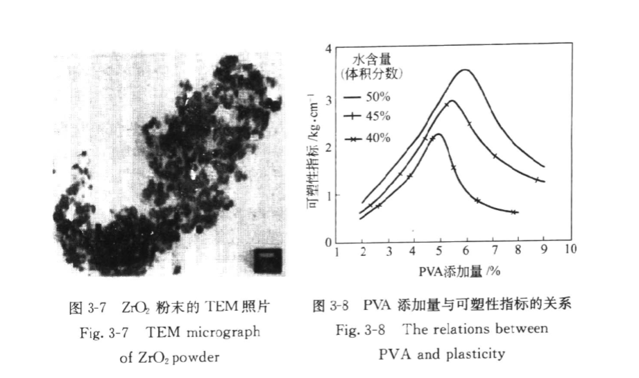 當(dāng)PVA在ZrO2表面的吸附量達(dá)到飽和時(shí),可塑性指標(biāo)達(dá)到最大。若繼續(xù)增加PVA,它不再吸附ZrO2顆粒而是自身成膜。因PVA膜膜很容易受剪應(yīng)力而破壞,破壞的PVA膜因其共價(jià)鍵的方向性不易重組,導(dǎo)致顆粒間的結(jié)合力下降,所以PVA過(guò)多反而使可塑性下降。
