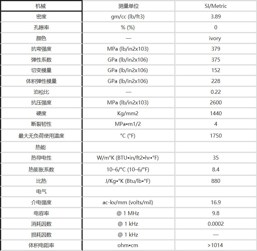 99.5%氧化鋁陶瓷性能表