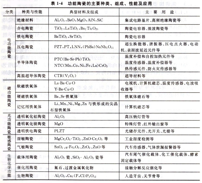 功能陶瓷是指以非力學(xué)性能(如電、磁、熱、化學(xué)、生物等性能)為主的陶瓷磚B=有些陶瓷材料既是結(jié)構(gòu)材料也是功能材料,如2r02、A12 03、SiC等。功能陶瓷制品具有品種多、應(yīng)用廣、更換頻繁、體積小、附加值高等特點,主要有金屬氧化物和Ba、Pb、Mg及Sr的鈦酸鹽等,表1-4簡要介紹幾種主要功能陶瓷。