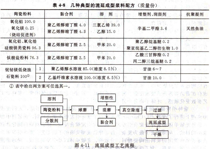 基于以上的原料選擇原則選擇合適的原料進行流延漿料的制備,典型的漿料配方和工藝流程如表4—8和圖4-11所示。